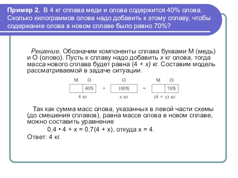 Решение. Обозначим компоненты сплава буквами М (медь) и О (олово). Пусть к сплаву надо добавить х кг олова, тогда масса нового сплава будет равна (4 + х) кг. Составим модель рассматриваемой в задаче ситуации.
