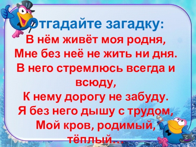 Отгадайте загадку:В нём живёт моя родня,Мне без неё не жить ни дня.В него стремлюсь всегда и всюду,К нему дорогу не забуду.Я без него дышу с трудом,Мой кров, родимый, тёплый…