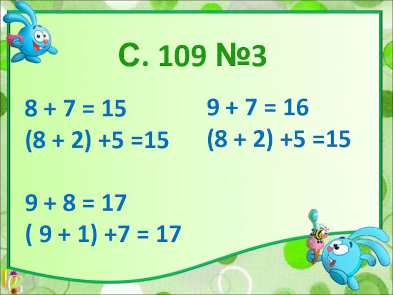 С. 109 №3 8 + 7 = 15 (8 + 2) +5 =15