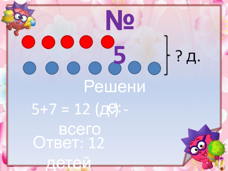 № 5Решение:5+7 = 12 (д.) - всегоОтвет: 12 детей? д.