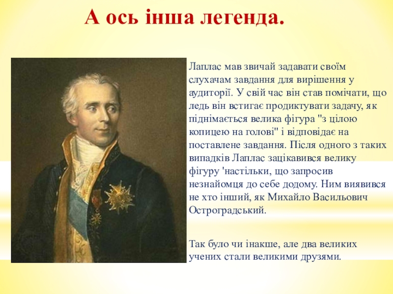 У той час Лаплас був постійно зайнятий вирішенням одного вельми важкого питання з небесної механіки. Він бився кілька днів, списуючи крейдою велику дошку, але обчислення виявлялися занадто довгими, і бажаного результату Лаплас так і не зміг отримати. Які ж були його здивування і радість, коли одного разу прийшовши додому, він побачив на дошці доведене до кінця перетворення його формул з давно вже передбачуваним їм результатом. Лаплас був здивований, коли з'ясувалося, що цей результат отримано його лакеєм.