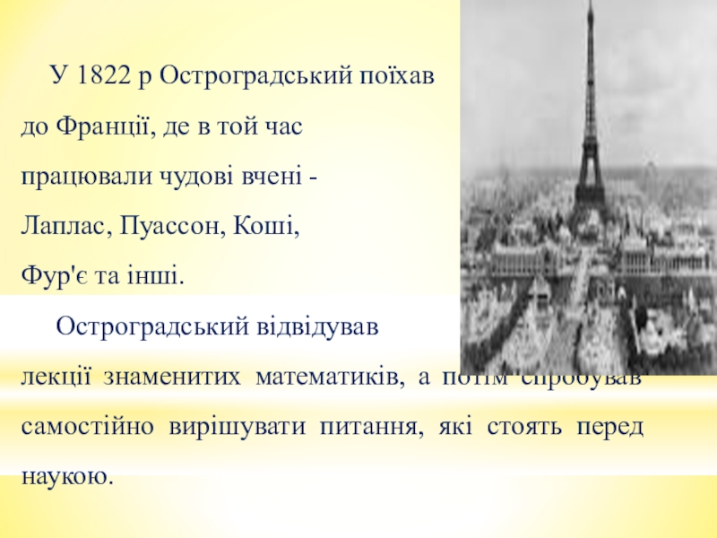 Коли на шляху до Парижа Остроградський був обібрав своїм попутником, то не став повертатися додому, а продовжив свій шлях "за способом пішого ходіння" і прибув до мети своєї подорожі без гроша в кишені. У Парижі він найнявся в лакеї до Лапласу.