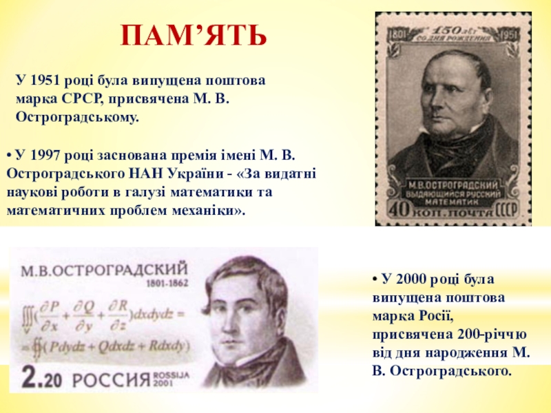 У 1951 році була випущена поштова марка СРСР, присвячена М. В. Остроградському.