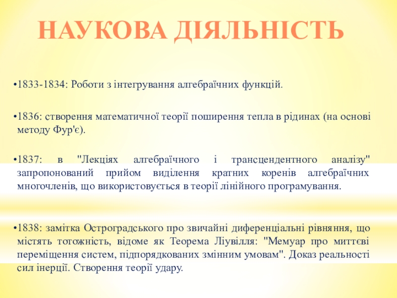 1838: замітка Остроградського про звичайні диференціальні рівняння, що містять тотожність, відоме як Теорема Ліувілля: "Мемуар про миттєві переміщення систем, підпорядкованих змінним умовам". Доказ реальності сил інерції. Створення теорії удару.