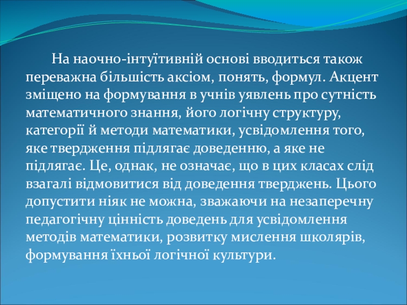 також переважна більшість аксіом, понять, формул. Акцент зміщено на формування в учнів уявлень про сутність математичного знання, його логічну структуру, категорії й методи математики, усвідомлення того, яке твердження підлягає доведенню, а яке не підлягає. Це, однак, не означає, що в цих класах слід взагалі відмовитися від доведення тверджень. Цього допустити ніяк не можна, зважаючи на незаперечну педагогічну цінність доведень для усвідомлення методів математики, розвитку мислення школярів, формування їхньої логічної культури.