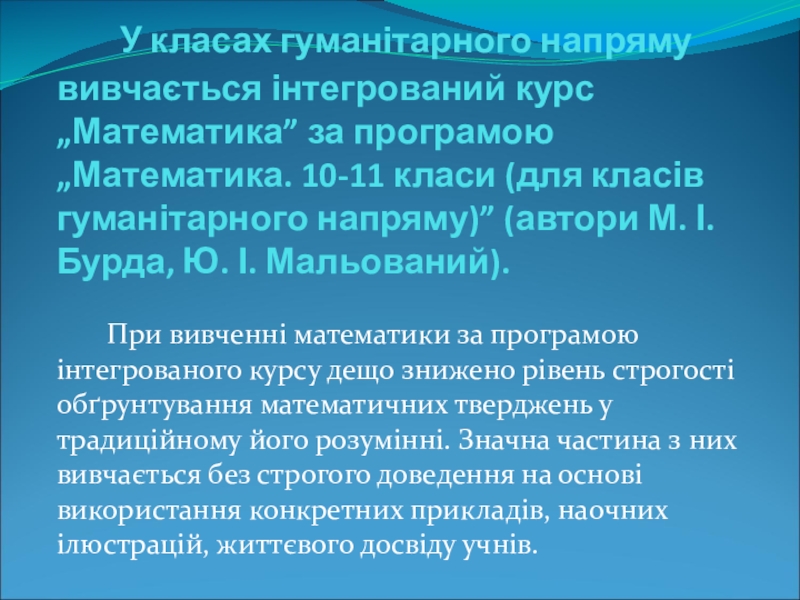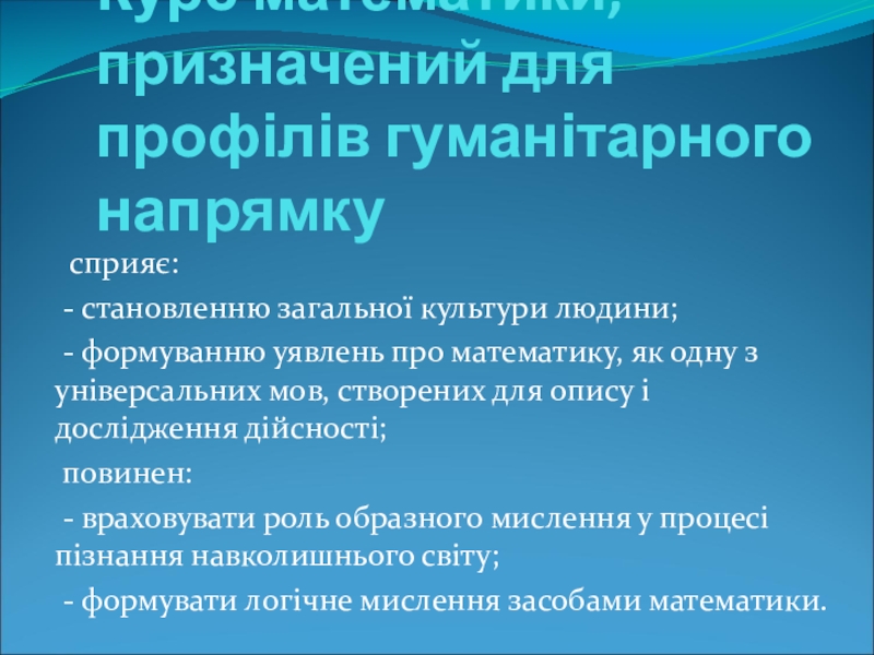 Слайд 3Курс математики, призначений для профілів гуманітарного напрямку