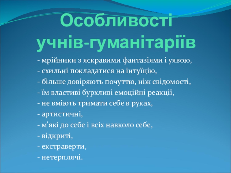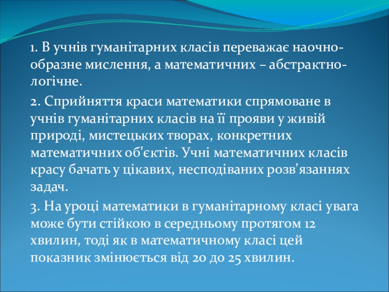 - психофізіологічні особливості учнів гуманітаріїв такі, які уповільнюють і утруднюють вивчення математики.