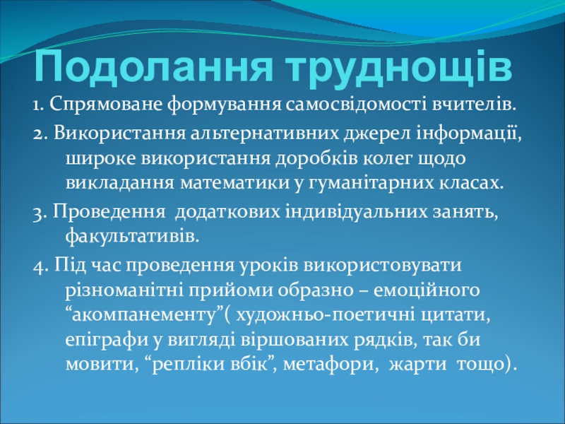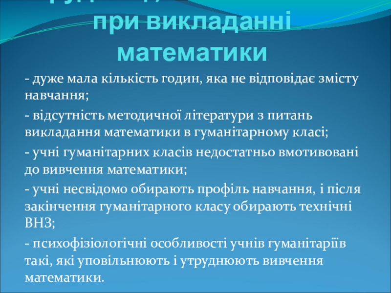 - відсутність методичної літератури з питань викладання математики в гуманітарному класі;
