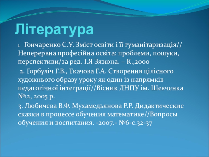 1. Гончаренко С.У. Зміст освіти і її гуманітаризація// Неперервна професійна освіта: