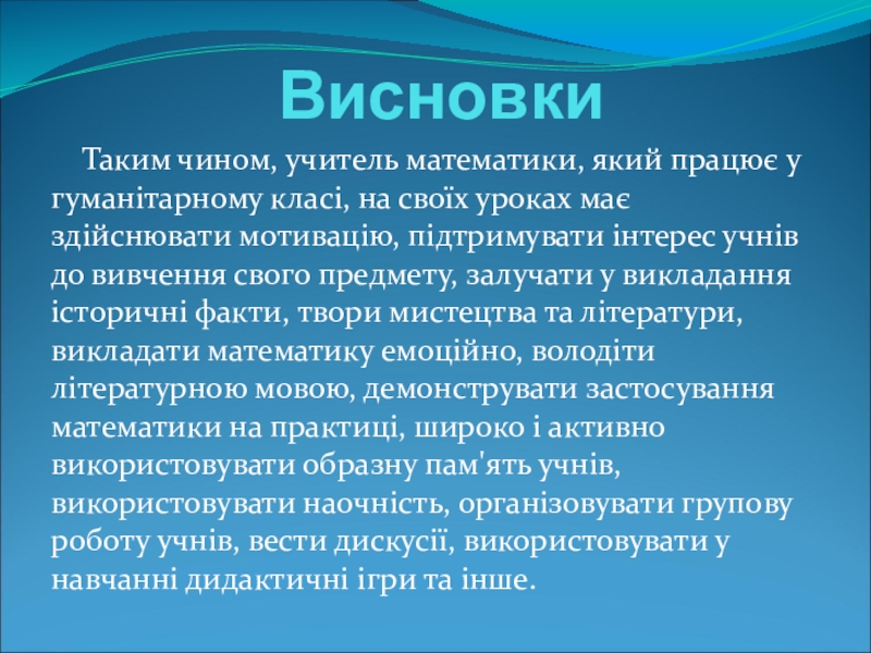 використання доробків колег щодо викладання математики у гуманітарних класах.