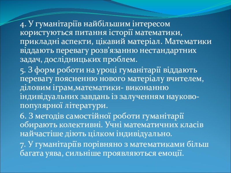7. У гуманітаріїв порівняно з математиками більш багата уява, сильніше проявляються емоції.
