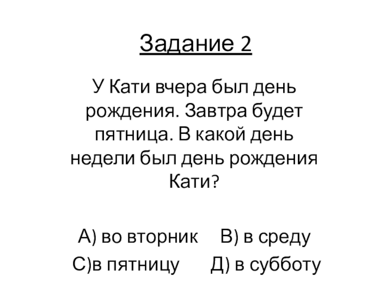 Задание 2У Кати вчера был день рождения. Завтра будет пятница. В какой день недели был день рождения