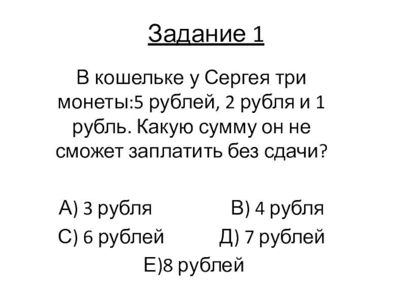 Задание 1В кошельке у Сергея три монеты:5 рублей, 2 рубля и 1 рубль. Какую сумму он не