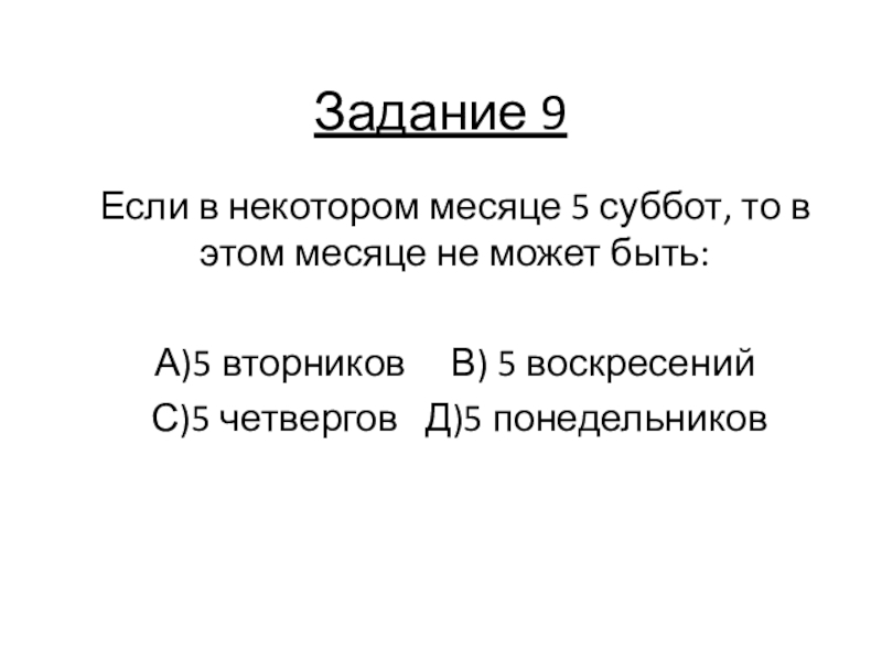 Задание 9Если в некотором месяце 5 суббот, то в этом месяце не может быть:А)5 вторников