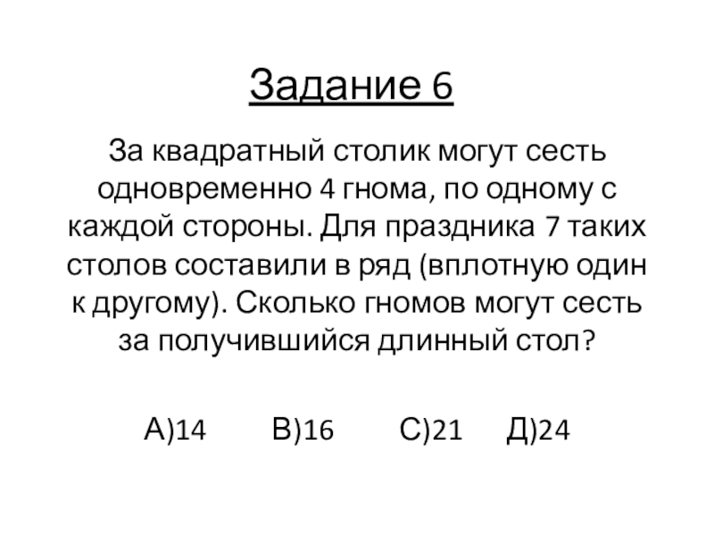 Задание 6За квадратный столик могут сесть одновременно 4 гнома, по одному с каждой стороны. Для праздника 7