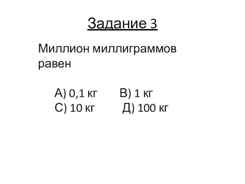 Задание 3Миллион миллиграммов равен   А) 0,1 кг    В) 1 кг