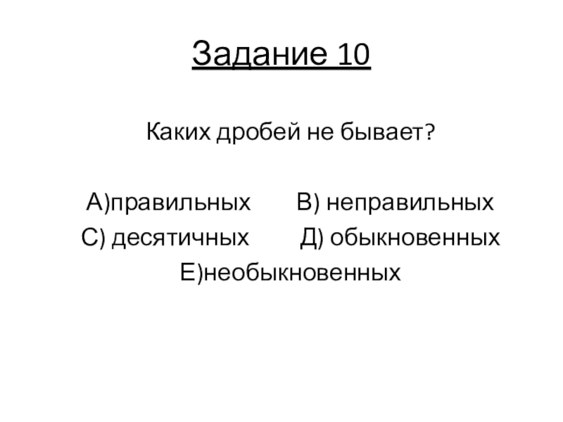 Задание 10Каких дробей не бывает?А)правильных    В) неправильных    С) десятичных