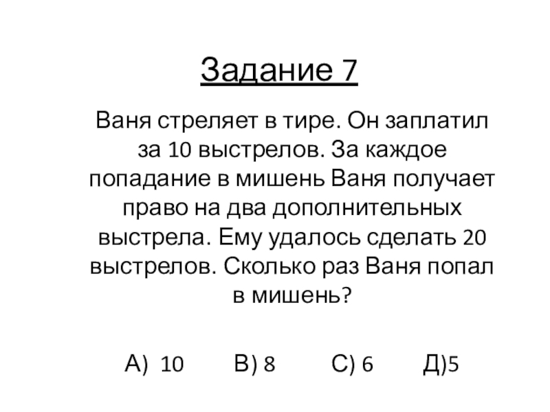 Задание 7Ваня стреляет в тире. Он заплатил за 10 выстрелов. За каждое попадание в мишень Ваня получает