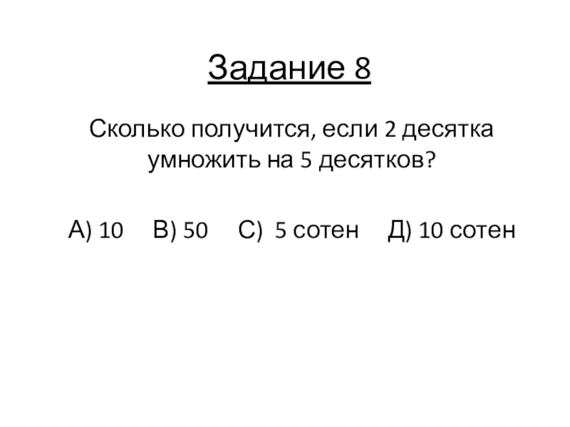 Задание 8Сколько получится, если 2 десятка умножить на 5 десятков?А) 10   В) 50