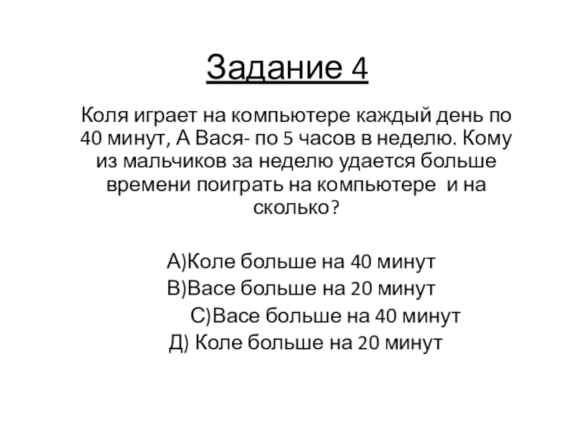 Задание 4Коля играет на компьютере каждый день по 40 минут, А Вася- по 5 часов в неделю.
