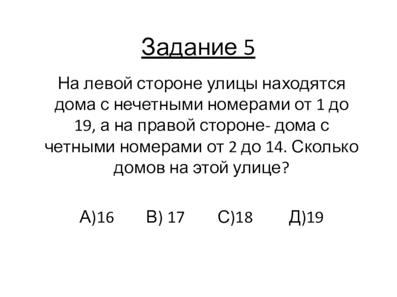 Задание 5На левой стороне улицы находятся дома с нечетными номерами от 1 до 19, а на правой
