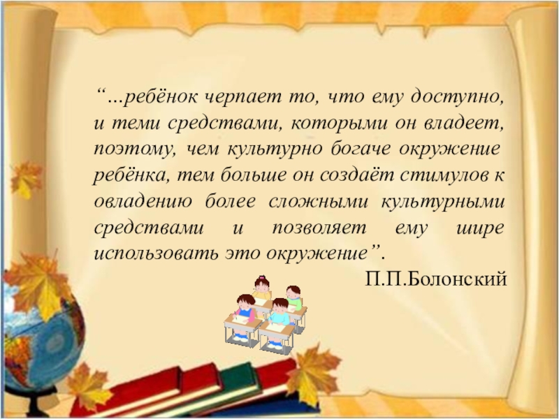 Слайд 24“…ребёнок черпает то, что ему доступно, и теми средствами, которыми он