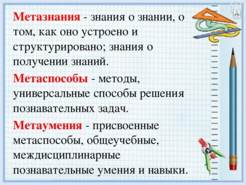 Слайд 5 Метаумения - присвоенные метаспособы, общеучебные, междисциплинарные (надпредметные) познавательные умения и навыки.