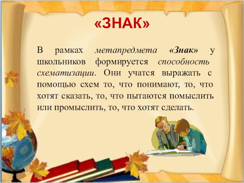 В рамках метапредмета «Знак» у школьников формируется способность схематизации. Они учатся