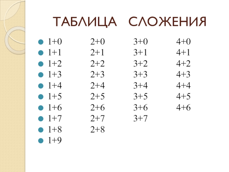 ТАБЛИЦА  СЛОЖЕНИЯ1+0      2+0      3+0