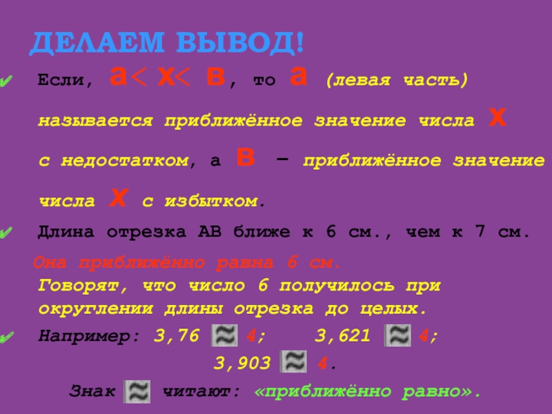 Она приближённо равна 6 см. Говорят, что число 6 получилось при округлении длины отрезка до целых.