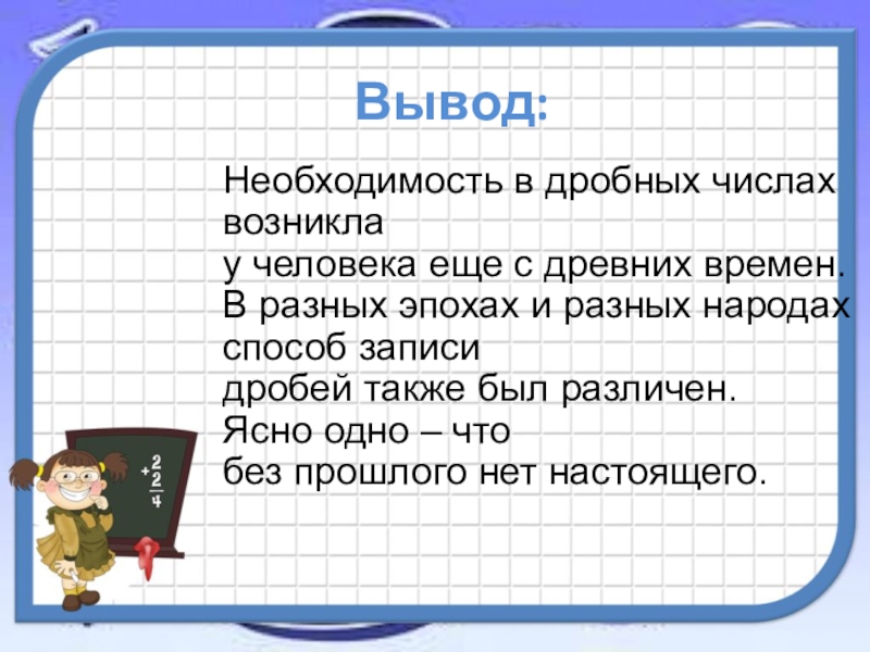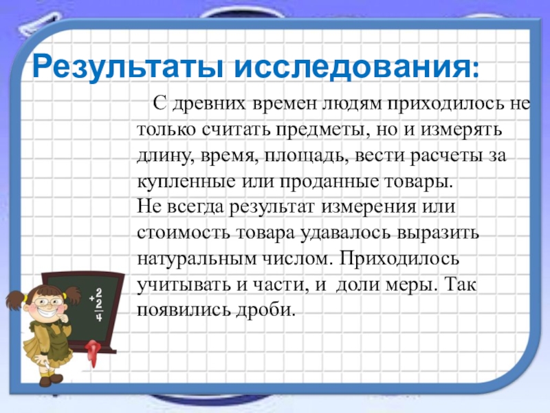Не всегда результат измерения или стоимость товара удавалось выразить натуральным числом. Приходилось учитывать и части, и доли меры. Так появились дроби.