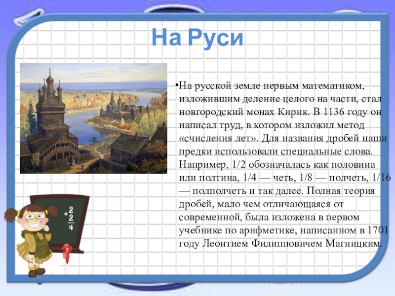 стал новгородский монах Кирик. В 1136 году он написал труд, в котором изложил метод «счисления лет». Для названия дробей наши предки использовали специальные слова. Например, 1/2 обозначалась как половина или полтина, 1/4 — четь, 1/8 — полчеть, 1/16 — полполчеть и так далее. Полная теория дробей, мало чем отличающаяся от современной, была изложена в первом учебнике по арифметике, написанном в 1701 году Леонтием Филипповичем Магницким.