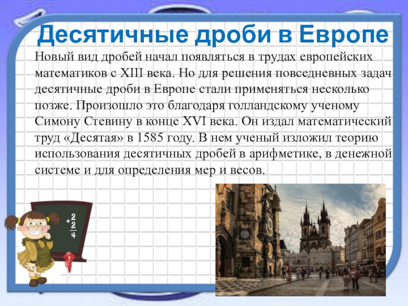 математиков с XIII века. Но для решения повседневных задач десятичные дроби в Европе стали применяться несколько позже. Произошло это благодаря голландскому ученому Симону Стевину в конце XVI века. Он издал математический труд «Десятая» в 1585 году. В нем ученый изложил теорию использования десятичных дробей в арифметике, в денежной системе и для определения мер и весов.