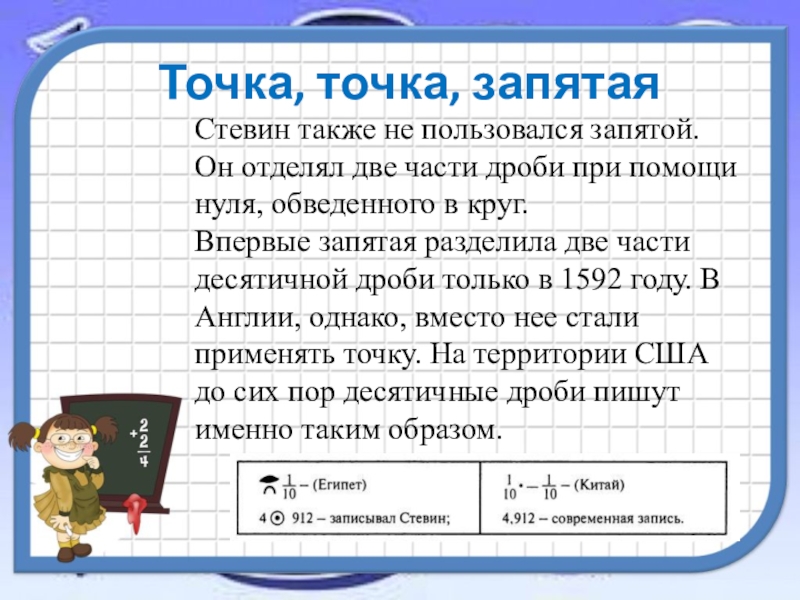 Впервые запятая разделила две части десятичной дроби только в 1592 году. В Англии, однако, вместо нее стали применять точку. На территории США до сих пор десятичные дроби пишут именно таким образом.