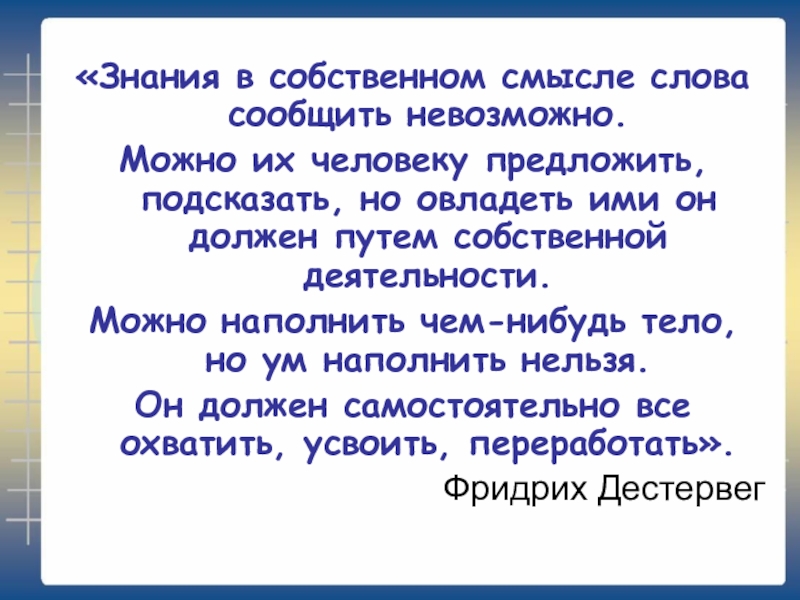 «Знания в собственном смысле слова сообщить невозможно. Можно их человеку предложить, подсказать, но овладеть ими он должен