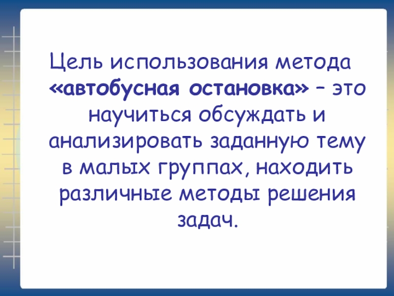 Цель использования метода «автобусная остановка» – это научиться обсуждать и анализировать заданную тему в малых группах, находить
