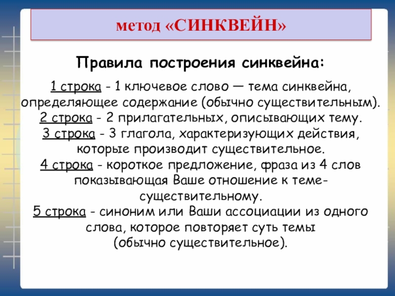 метод «СИНКВЕЙН»Правила построения синквейна:1 строка - 1 ключевое слово — тема синквейна, определяющее содержание (обычно существительным). 2