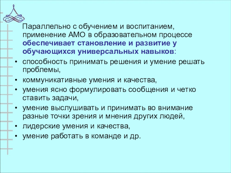 Слайд 30 Параллельно с обучением и воспитанием, применение АМО в образовательном