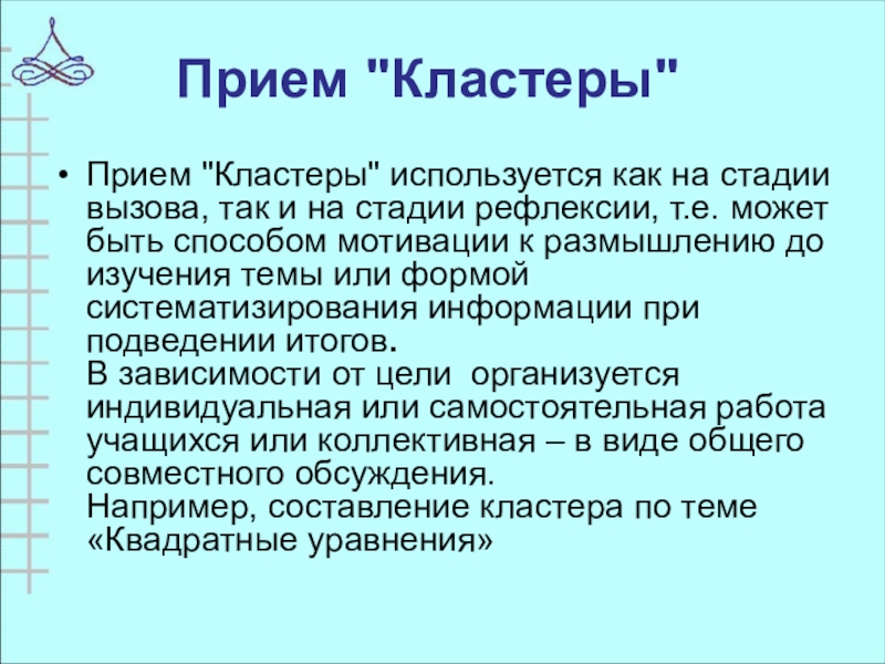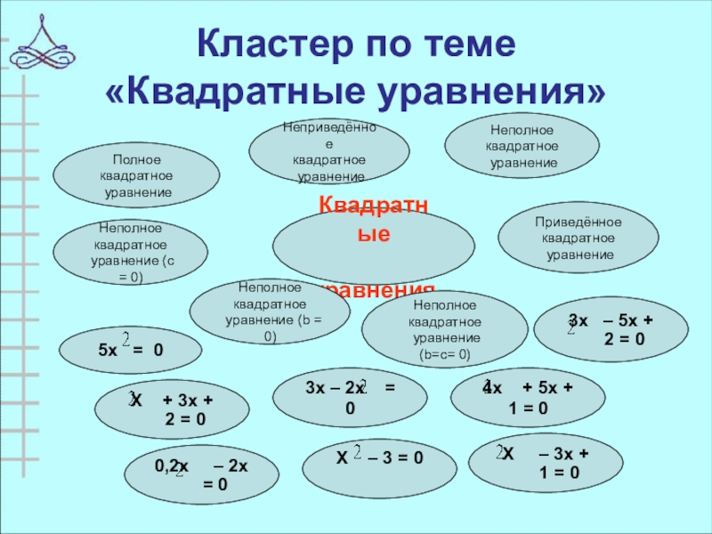 Например, составление кластера по теме «Квадратные уравнения»