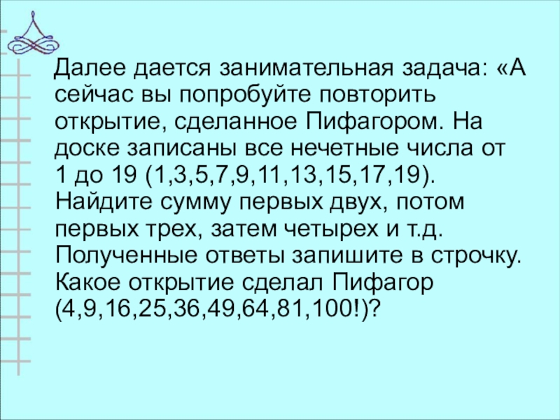 открытие, сделанное Пифагором. На доске записаны все нечетные числа от 1 до 19 (1,3,5,7,9,11,13,15,17,19). Найдите сумму первых двух, потом первых трех, затем четырех и т.д. Полученные ответы запишите в строчку. Какое открытие сделал Пифагор (4,9,16,25,36,49,64,81,100!)?
