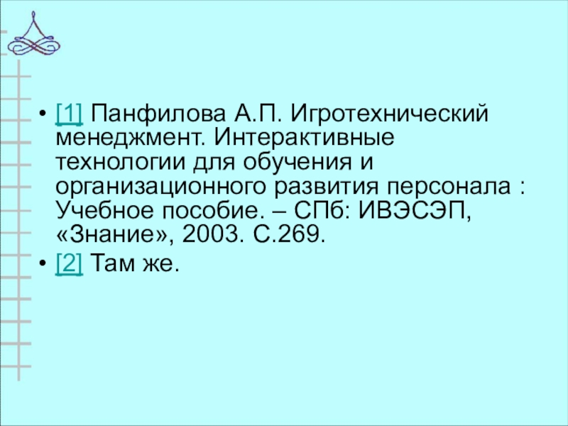 [1] Панфилова А.П. Игротехнический менеджмент. Интерактивные технологии для обучения и организационного