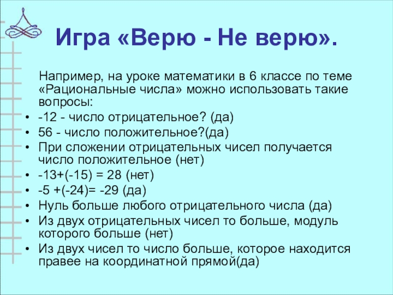 6 классе по теме «Рациональные числа» можно использовать такие вопросы: