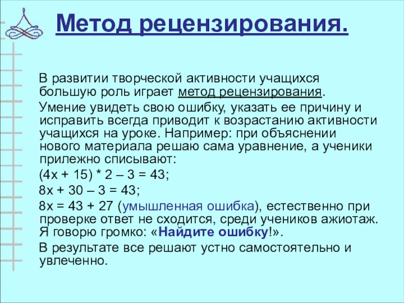 Умение увидеть свою ошибку, указать ее причину и исправить всегда приводит к возрастанию активности учащихся на уроке. Например: при объяснении нового материала решаю сама уравнение, а ученики прилежно списывают: