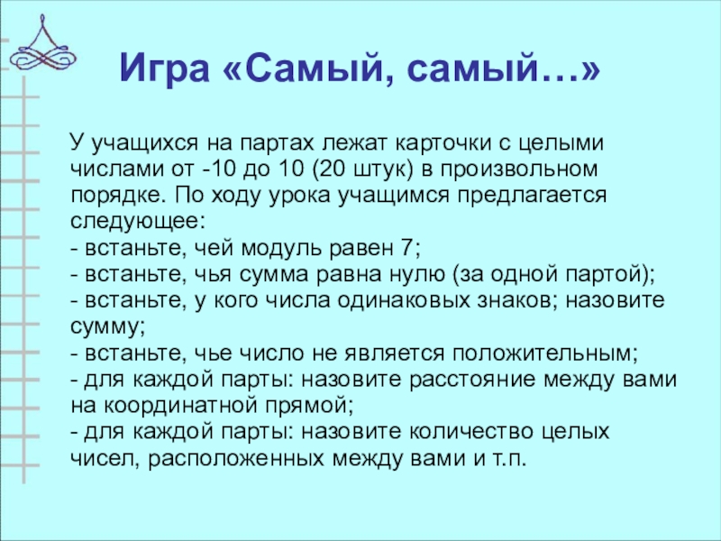 от -10 до 10 (20 штук) в произвольном порядке. По ходу урока учащимся предлагается следующее: