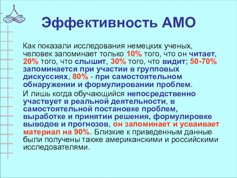 10% того, что он читает, 20% того, что слышит, 30% того, что видит; 50-70% запоминается при участии в групповых дискуссиях, 80% - при самостоятельном обнаружении и формулировании проблем.