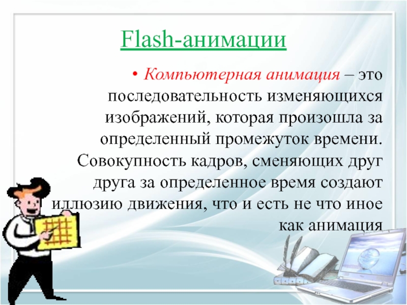 Flash-анимацииКомпьютерная анимация – это последовательность изменяющихся изображений, которая произошла за определенный промежуток времени. Совокупность кадров, сменяющих друг