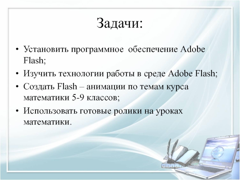 Задачи:Установить программное обеспечение Adobe Flash;Изучить технологии работы в среде Adobe Flash;Создать Flash – анимации по темам курса