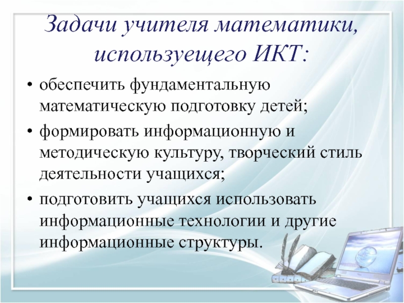 Задачи учителя математики, используещего ИКТ:обеспечить фундаментальную математическую подготовку детей;формировать информационную и методическую культуру, творческий стиль деятельности учащихся;подготовить