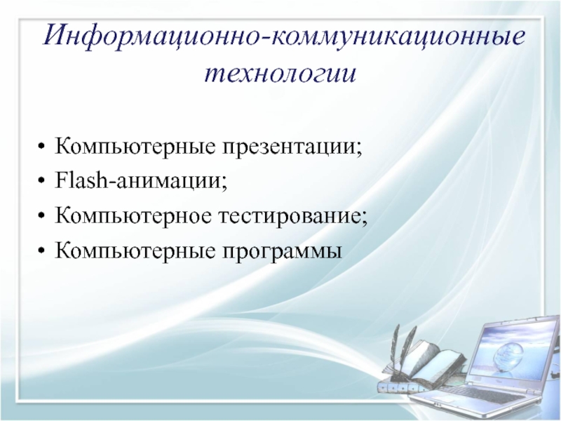 Информационно-коммуникационные технологии Компьютерные презентации;Flash-анимации;Компьютерное тестирование;Компьютерные программы