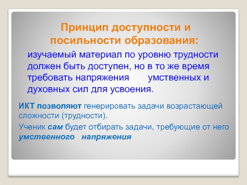 изучаемый материал по уровню трудности должен быть доступен, но в то же время требовать напряжения умственных и духовных сил для усвоения.